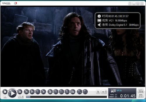 在播放1080P VC-1高清电影时,CPU占用率多数情况都没有高于20%,但离100%硬解还有一定距离。