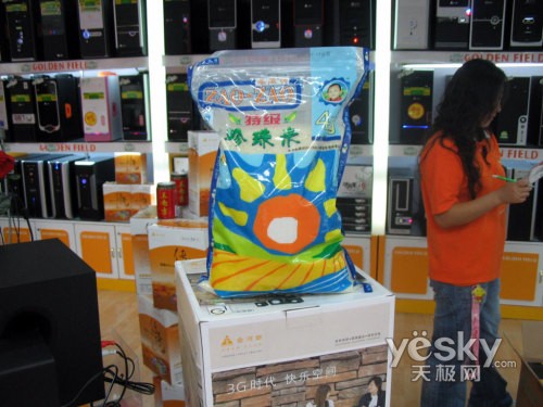 编辑转市场的时候,发现海龙4层金河田产品专卖店那特别热闹,不少买了音箱的朋友手上都拿着袋大米。编辑凑过去才明白,原来金河田正在对其新上市的几款音箱在搞促销活动。