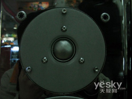 另外音箱左右两侧的旋钮也极具特色,主要是用于调节重低音和音量,经电镀处理,金属质感强烈,操作起来也很方便。在加电后,可以看到主音箱的前面板还有一盏幽蓝的LED灯,更具风味……
