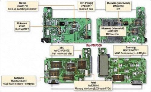 我们由此可见,RIO PMP300的设计方案主要以NEC的8bit单片机为核心,Actel的FPGA作为接口逻辑和SM卡控制器,再搭配上Micronas的DSP和DAC,Samsung的NANDFLASH和Maxim的PMU(电源管理芯片)。这样的方案设计,基本上是符合冯·诺依曼的结构特点的,而且也与今天的MP3总体结构相差不大。而在PMP300发布的一年后,Compaq也发售了第一台使用硬盘存储的MP3播放器HanGo PJB-100。而它的设计则采用了MOTOROLA DSP56000+MICRONAS的方案。