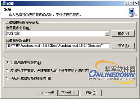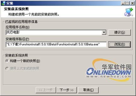 然后就会弹出安装前系统快照生成窗口(如图4),在监视应用程序名称框中输入应用程序的名称“风行电影”,接着在安装程序路径中填写上风行电影安装程序的本地硬盘路径,然后选择“构建一个新的快照”,最后点击“下一步”按钮。