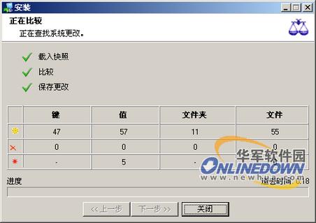 接着Total Uninstall会对系统作再次扫描,并且与前面的快照进行比对,用表格的方式列出更改的注册表键值与文件数(如图8),点击“关闭”后回到Total Uninstall主界面。