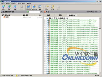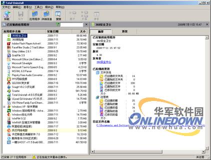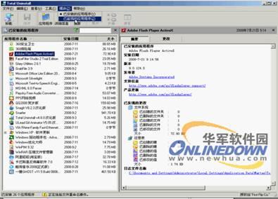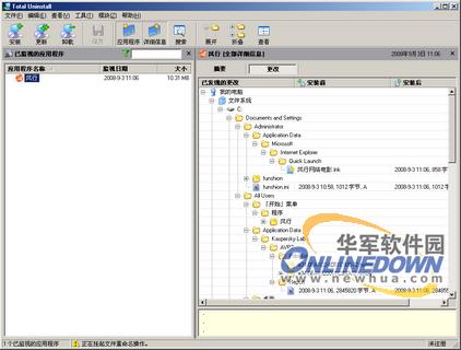 在Total Uninstall主界面左边一栏可以看到被监视安装程序列表(如图9所示),点击其中一个安装程序,就可以在右边栏中可以看到被监视软件安装后被更改文件与注册表键值的详细资料。