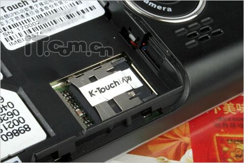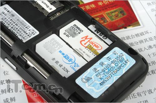 拿出电池以后,由天语D780的双SIM卡座可看出其支持双卡双待功能。在3个卡槽中一个是CDMA卡槽,另一个是GSM卡槽,当然较小的那个卡座是为Micro SD存储卡所准备的。而在两个卡槽旁边写清了卡槽的具体类别,方便用户的SIM卡对号入座。