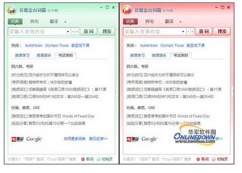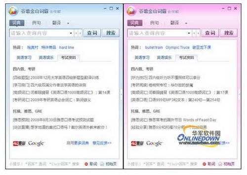 最后,谷歌金山词霸也支持自定义界面,通过菜单-界面就可以选择各种皮肤,目前有粉色、灰白、白色、土黄、土红、浅绿、橘红,这也是谷歌金山词霸个性化的选择,方便大家选择自己喜欢的色彩。