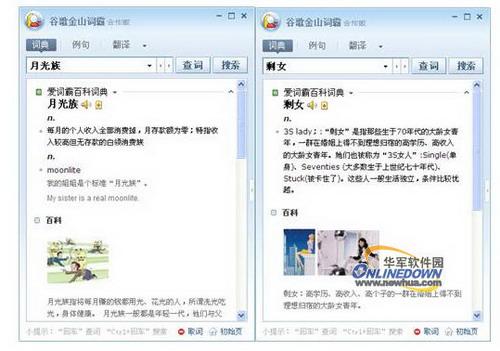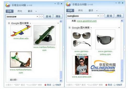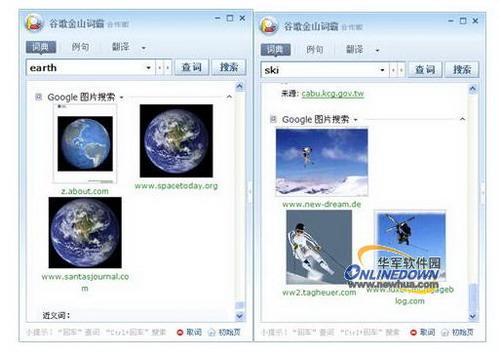 《谷歌金山词霸》中新增了一个有趣的功能图片搜索,我们在词典管理中加入谷歌图片搜索后,我们就可以使用了。图片搜索是对词条的图形化解释,这便于我们更好的理解词条的意思,比如一些描述具体实体的词条,就可以看到《谷歌金山词霸》给出的图片解释,而且这个配图非常准确的,如下图。