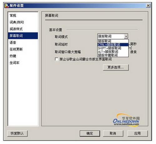 谷歌金山词霸支持DIY各种设置,非常人性化,比如不喜欢即指即译的取词方式的用户可以选择半自动的CTRL+鼠标取词等等,也可以选择全手动的鼠标中键取词等其他快捷方式。如下图。