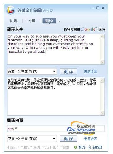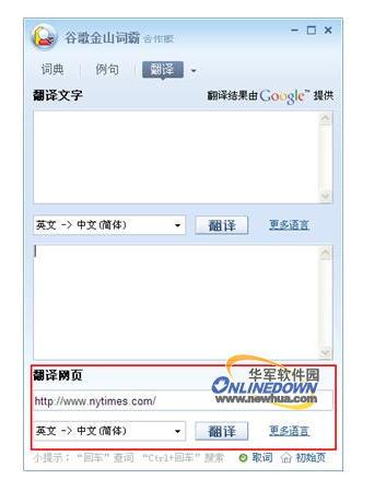 《谷歌金山词霸》新增了对网页翻译的支持,您可以在《谷歌金山词霸》中直接输入网址并选择语种,实时显示翻译结果,翻译引擎采用由谷歌自行开发出了基于统计的翻译系统网页翻译引擎,翻译技术目前全球领先,能提供给您最为精准的翻译效果,如下图,在翻译网页栏中填入URL地址,即可翻译网页。