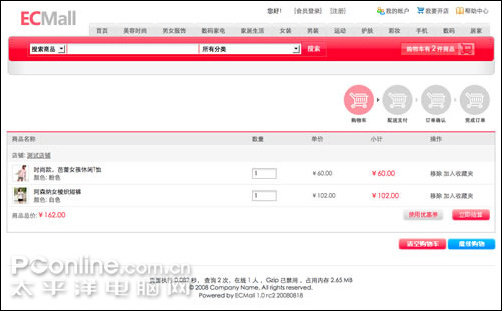 ECMall支持购物车的功能,避免了用户在购买多件商品时需要和卖家沟通进行合并订单的麻烦。同时ECMall的结算流程设计能够顺利的引导用户完成订单的交易,尽可能的减小商品在结算过程中的丢弃率。
