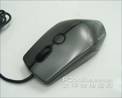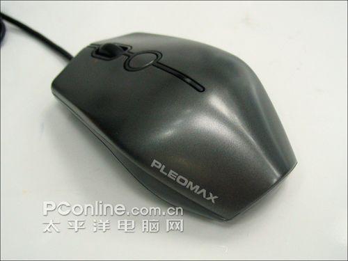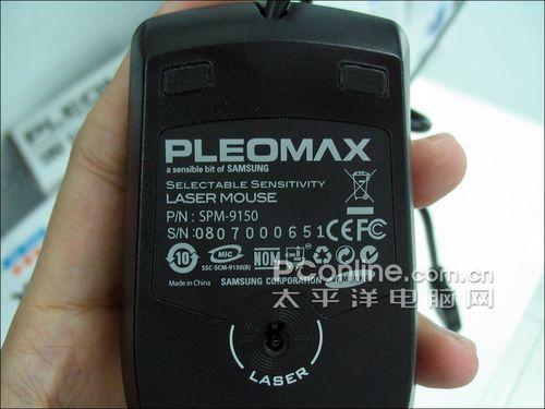 从这个角度看,可以清楚看到三星PLEOMAX SPM-9150夸张的造型,尾部印有“PLEOMAX”的LOGO。造型与常见的鼠标有所不同,背部强烈地驼背,底部也有些收缩的感觉,方便使用时提起鼠标,手感很强,很适合游戏,不过鼠标尺寸稍微嫌小,大手的男生最好试试手再买。