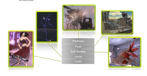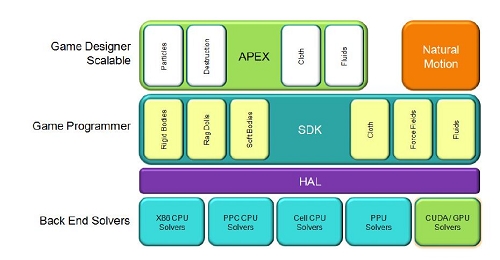 论是GPU还是CPU、PPU、Cell(PS3)都可以通过HAL翻译层来实现软、固质体动力(Soft or Rigid Body Dynamics)、通用碰撞侦测(Universal Collision Detection)、有限元素分析(Finite Element Analysis)、流体动力(Fluid Dynamics)、毛发模拟(Hair Simulation),以及更更高级开发平台APEX中的更先进的布料模拟(Cloth Simulation)、自然模拟(Natural Motion)等在内新颖技术。