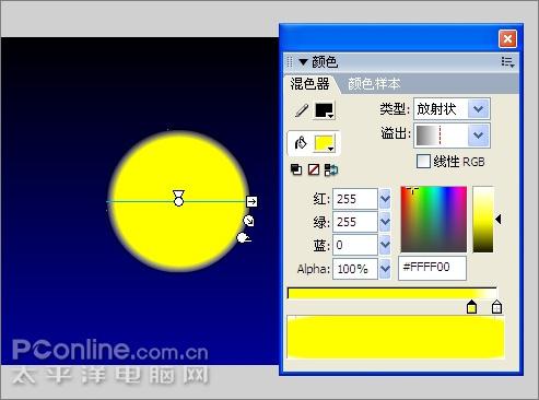 5、在混色器面板中将填充设为由黄到白色的渐变,类型为“放射状”,注意渐变条上黄色色块的位置。用填充变形工具调整渐变到如下大小,形成带着光晕的月亮。