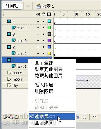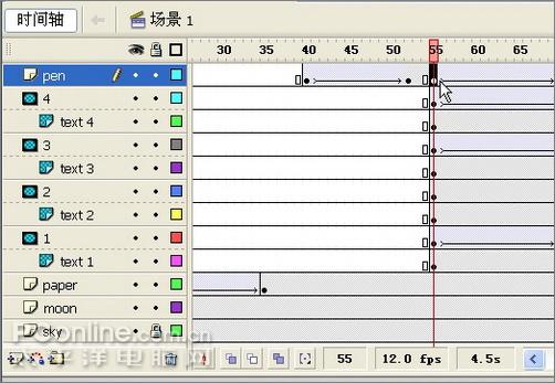 28、下面开始做毛笔写字的动画。在第55帧处给毛笔层插入关键帧,另外将所有的文字层及其遮罩层的第1个关键帧都设在这里。