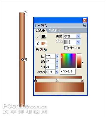 13、画毛笔。Ctrl+F8新建一个元件,命名为“pen”。用矩形工具画一个细长的矩形,在混色器中将填充设置为从棕色到浅棕色再到棕色的渐变,类型为“线性”。