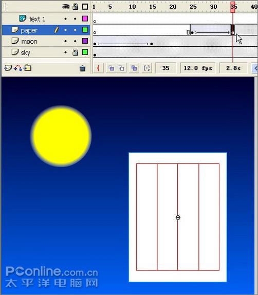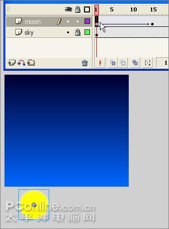 22、选择第1帧,将月亮垂直拖放到画布以外,完成月亮升起的动画。
