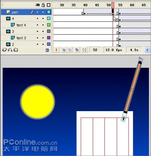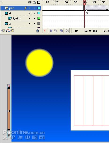 26、新建一个图层,命名为“pen”。先在第40帧插入关键帧,在库面板中将毛笔元件拖进来,放在画布左侧外面。