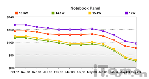 主流的14.1寸宽屏面板自去年起一直稳步下跌,今年6月起的急降更是暑期笔记本价格暴降的原因之一。