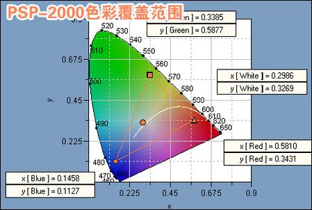 上图为专业仪器的实测数据结果,图中的舌形区域表示人类视觉可以看到的色彩范围,三角形区域就是PSP的色彩覆盖范围。