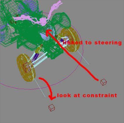 在场景中我在每个车轮前放置了两个虚拟的参照物,然后让车轮与虚拟的参照物运动同步,再把虚拟的参照物体与操纵杆绑定相连。这样当操纵杆运动时便会带动虚拟的参照物运动,从而带动车轮一起转动。