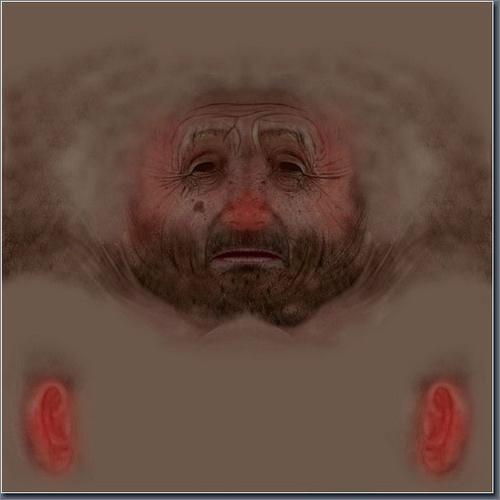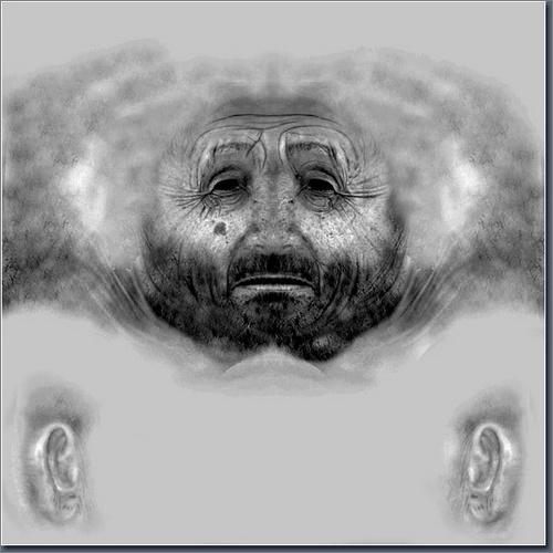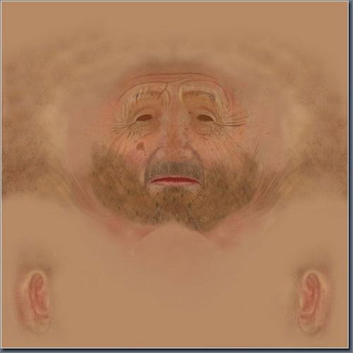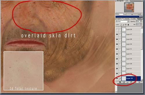 我继续添加一些污垢在皮肤上,并给皮肤一些色彩上的变化,用 3D Total Texturees V4:R2(Human&Creatures)来深化皮肤细节,通过对皮肤的处理来表现人物的年龄。因为我的模型是一个年迈且贫寒的人物,所以在面部加了少许污垢,而且呈现出皮肤病的纹理特征。