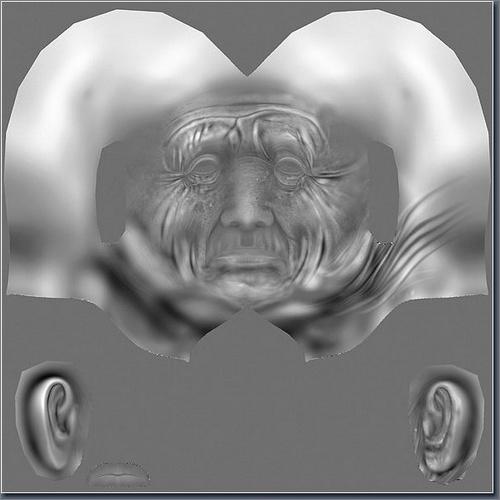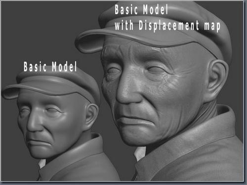 将模型导入zbrush增加皮肤皱纹以及面部凹凸等细节。让渔夫看上去更加沧桑,再将置换贴图导出并设置分辨率为2048*2048,效果如图。