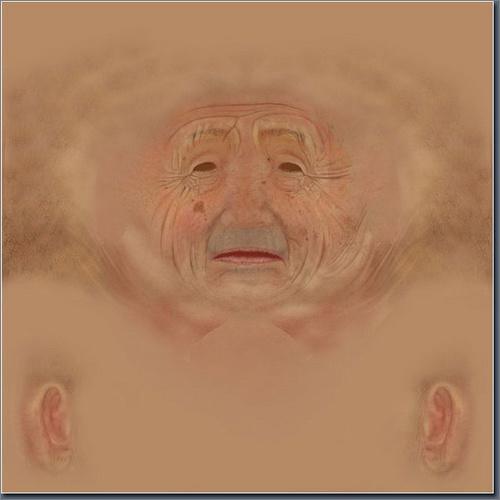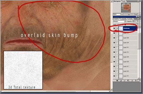接着,我将置换贴图覆盖于原贴图之上,取得更加细致的皱纹细节,这也有利于下一步对皱纹大小位置的掌握。