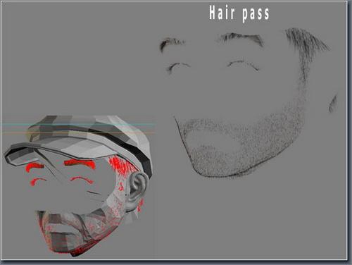 在应用贴图取得正确的皮肤材质效果后,继续为渔夫制作毛发,这里我采用两张贴图用于毛发修改器,分别用于控制浓度和色彩。