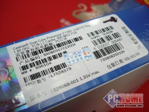 目前已经成为了低端主流的赛扬L系列处理器不但采用了65nm核心制程,更重要的是它使用了性能强劲的Conroe架构,从此彻底摆脱了高频低能的阴霾。正是赛扬420的成功,才使得Intel更加有信心将的推出了全新的双核心赛扬处理器——E1000系列,今天小编在市场中看到了其E1000系列中最低端的E1200双核赛扬处理器,该款处理器采用原装盒包,但与其他盒包产品不同的是,该款产品并没有配备原装风扇,其售价为269元,继AMD双核闪龙杀至275元以内之后,这个是目前最便宜的第二款双核CPU。
