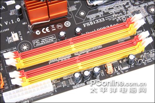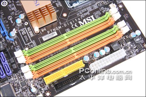 主板的内存插槽,该主板一共提供了4个内存插槽,可以支持最高DDR2 800MHz的双通道内存模式。