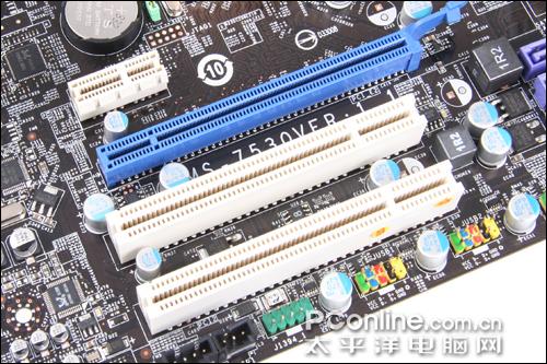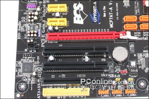 主板提供了1条PCI-E 2.0 16X插槽和2条PCI-E 2.0 1X插槽以及3条PCI插槽,可以满足大多数用户的扩展需求。