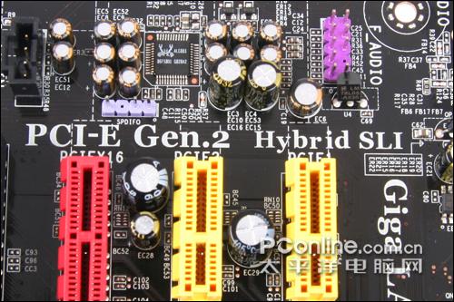 有意思的是,在精英主板的扩展接口部分,印有Hybird SLI字样。根据我们从NV得到的确切消息,MCP7A芯片组中的两个型号MCP7A-S和MCP7A-U都是能够支持Hybird SLI的,目前这两块主板的步进都为B1步进,那么很可能在正式上市的B2步进版本的主板上,就能够实现Hybird SLI了。不过,该芯片组支持了Hybird SLI,但是并不支持Hybird power,大家要注意这一点。