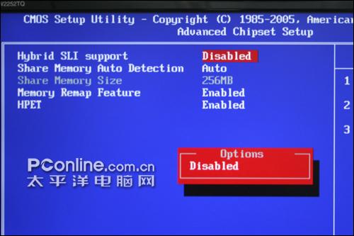 在两块主板的BIOS中,我们都无法打开混合SLI选项,其中精英主板上SLI的选项里仅有Disabled选项,而在微星主板里,SLI的选项则为灰色状态,无法选择。