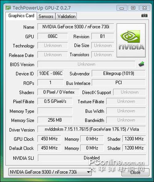 在最新的0.2.7版本GPU-Z中,我们无法取得MCP7A-S的全部信息,仅仅能够得知该B1步进的Geforce 9300显示核心频率为450Mhz,Sharder频率为1200Mhz。