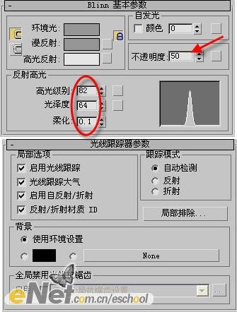 4、选择第三个材质球,为其指定一种玻璃材质,打开“Blinn 基本参数”卷展栏,修改其高光级别,并打开“贴图”卷展栏,为“折射”指定一光线跟踪贴图,如图5所示,将该材质赋予Teapot03。