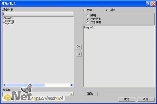 3、打开“常规参数”卷展栏,在阴影栏下的列表中选择“光线跟踪阴影”项,单击“排除”按钮,打开其窗口,将此茶壶添加到右边列表中,点击确定。从而此茶壶不会产生任何阴影。如图8所示。