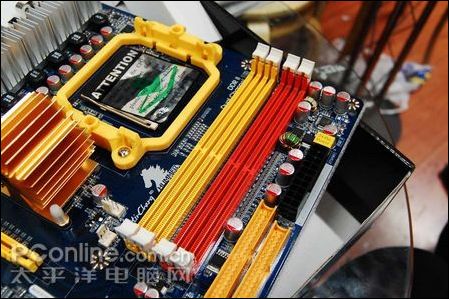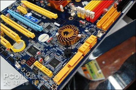 捷波 悍马HA04主板提供了4个DDR2内存插槽,支持双通道DDR2 1066/800/677MHz内存规格,最高8GB。主板6个SATA 3.0Gb/s端口,支持RAID 0、1、0+1、JBOD磁盘阵列功能,还有1个Ultra DMA 133/100/66连接端口。针对超频发烧友,主板设置了独立的清除CMOS/开关/重启按钮,还有数字LED诊断灯,方便使用。HA04提供了3条PCI-E显卡插槽,其中2条为PCI-E x16结构,支持ATI CrossFireX技术,并且为PCI-E 2.0规格。可支持三卡交火,并且提供了用来联接三块显卡的桥接卡以及用以自动分配显卡插槽模式的转换卡。另外,蓝色的还可用来插物理显卡。主板还提供1条PCI-E x1插槽和2条传统PCI插槽,方便扩展。