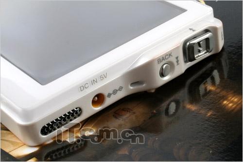 根据人手指操作习惯,PMX-M86机身右侧也安置了不少重要的按键,最上方是设计独特的五向导航键,与下面的Back按键共同突出于表面,既方便按压,也增添了机器整体的时尚美。在突出部分和原有部分交界处还设置了挂绳孔,在右侧的平整部分则是电源接口及扬声器。