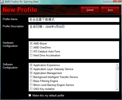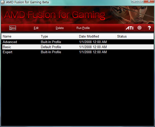 点击“Fusion”图标左上角的“+”图标,就进入了AMD Fusion for Gaming Beta的完整界面,界面布局和功能都非常简单。最上面是按钮栏,从左到右依次是“New”、“Edit”“Delete”“Run Profile”,右边是Catalyst面板OverDrive的快捷方式,推到上图简易模式的按键和”?“帮助按键,下面提供了“Advanced”、“Basic”、“Expert”三种模式。软件默认是“Basic”基本模式,AMD给用户提供了“Advanced”进阶和Expert”专家两种优化模式。