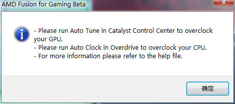 运行优化模式之前,软件会弹出提示,要求你打开Catalyst控制面板GPU超频的自动调节功能,并打开CPU的自动超频功能。