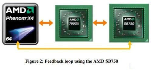 据AMD技术文档信息,SB750芯片和AM2+插座之间拥有一个六针直连界面,而现在Phenom处理器上有两个针脚是直接与SB750相连的。这两个针脚此前没有任何实际用途,而现在成了处理器和南桥的通信通道。这样一来,SB750配合新BIOS就可以接管处理器的一些内部设置,进而提升超频空间。