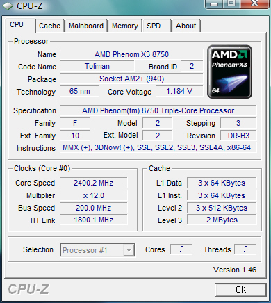 处理器 | AMD Phenom X3 8750(65nm、主频2.4G、L2为2M) |