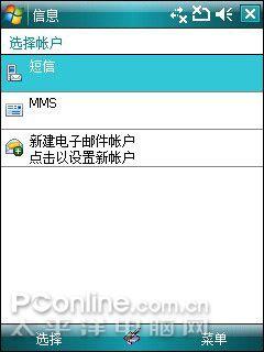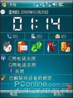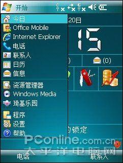 系统待机界面,界面中上部有5个快捷图标,可以自己设定需要的功能在这里显示,操作起来很方便,直接点击就会进入。此外在待机界面下方列出了几个日常使用的选项提示也可以自己定义的,点击上方的“开始”按钮就可以进入手机操作系统的各个选项进行操作,这点与传统的XP界面一样。