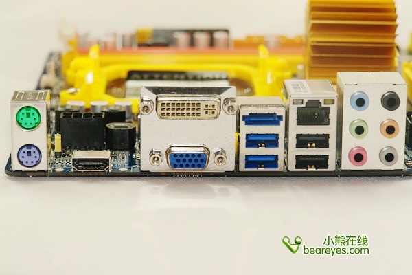 在I/O接口设计上,捷波悍马HA07提供了标准的PS/2接口、4个USB 2.0、1个E-SATA以及一个RJ-45千兆以太网络接口,音频方面则是HD-Audio 7.1声道输出。集成主板最主要的视频输出方面,悍马HA07除了标准的VGA和DVI接口,还提供了原生的高清标准接口HDMI,对于连接大屏设备来说非常方便,考虑得相当周到,人性化十足。