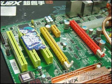 超磐手AF750+ GTR从性能考虑屏蔽了这个集成显示功能,全面支持独立SLI。这主要是考虑到混合SLI主要应用于低端整合主板,配合低端独立显卡虽然性能提升明显,是作为高端定位的AF750+ GTR用户群基本采用NVIDIA GeForce8/9级别显卡,这样混合SLI的效能较小,反而不如高性能的独立显卡。所以主板特别提供了两条PCI-E插槽,支持SLI技术,可以选择单卡PCI-E ×16模式或者双卡PCI-E ×8模式工作。另外还有三个PCI扩展插槽和一个PCI-E 1x插槽,满足设备扩展的需要。