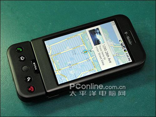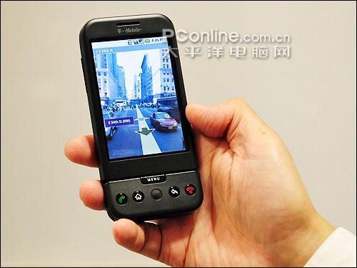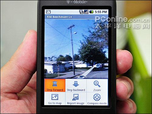 HTC营销部长在解说G1功能的时候,第一个秀的就是Google Maps的「街景视图」(Street View)功能,它可以让你在特定的城市中开启,程序会显示选定点四周的真实街景样貌,你不但可以东南西北360度看,也能往上及往下看。这功能也许很多人已经在电脑上的Google Maps里玩过,不过G1把它放到手机中,并且还可搭配手机内置的电子罗盘与加速度感应器,只要把手机朝向不同的方位,街景视图的视角也会自动跟着改变,让用户找路更容易、也更有临场感。