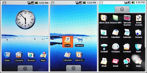 Android操作系统如同iPhone一样,操作方式主要以触控为导向,在待机画面下,除了大大的指针时钟之外,下面是常用的电话拨号、联络人、网络浏览器与地图;屏幕底部有一个灰色的「抽屉」,只要把抽屉往上滑动,就可以拉出手机内的所有程序,如果你有常用的程序,也能拉出来放在桌面上,并且可以像iPhone一样左右滑动换页,设计上非常直觉,而且就在现场观看的感觉,G1的Android系统完全不会有迟滞的情形发生,从头到尾只有一个「顺」字形容。