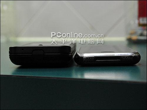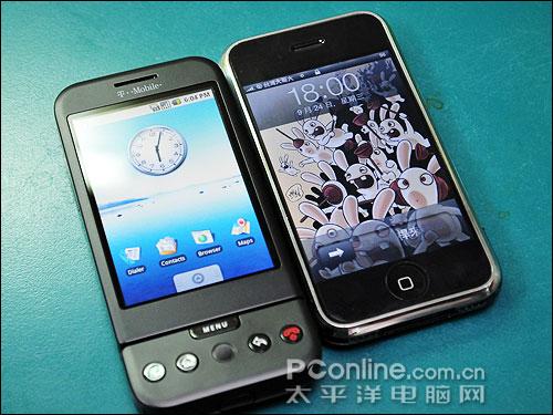 接下来,我们请出G1的劲敌:苹果iPhone来做一下外观的比较。G1比iPhone稍微长一些,也因为具有滑盖QWERTY键盘的关系而比较厚;而iPhone的3.5英寸屏幕,就比G1大得多了。