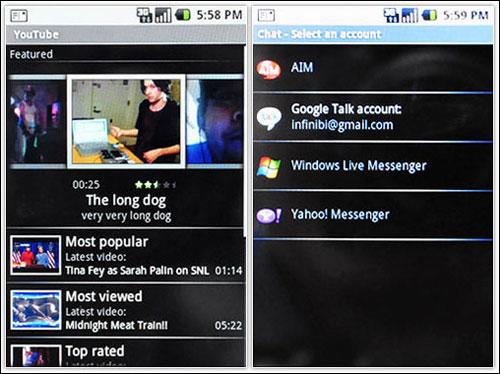 既然Android是Google一手主导,想当然手机会内置YouTube浏览器,另外G1也有一个实时通讯软件「Chat」,它可能是手机内置的实时通讯软件中支持最多通讯协议的,包括MSN、AOL、Yahoo!、当然还有自家的Google Talk,这样一来你不用再花钱买其它的实时通软件了。