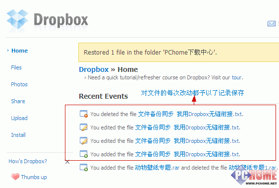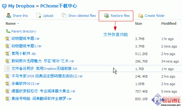 2、文件删除不怕 有后悔药保障:文件误删在日常使用中或多或少都会发生,如果不小心将“My Dropbox”文件夹中的文件删除了,我们可以实用Web端的“Restore files”功能(图4)来恢复误删文件。