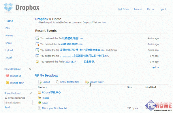 之前一直备受关注的在线网络存储服务-Dropbox于9月结束内部测试后,小编在第一时间进行了体验,于是决定将其作为自己首选的文件同步和备份工具。因为其完全符合小编的需求,它采用客户端和Web服务相结合的方式,并能和系统实现无缝衔接,将网络硬盘映射为本地硬盘,对本地文件的任何编辑修改,都能自动同步至网络空间上,而且操作简单,上传速度亦不慢。